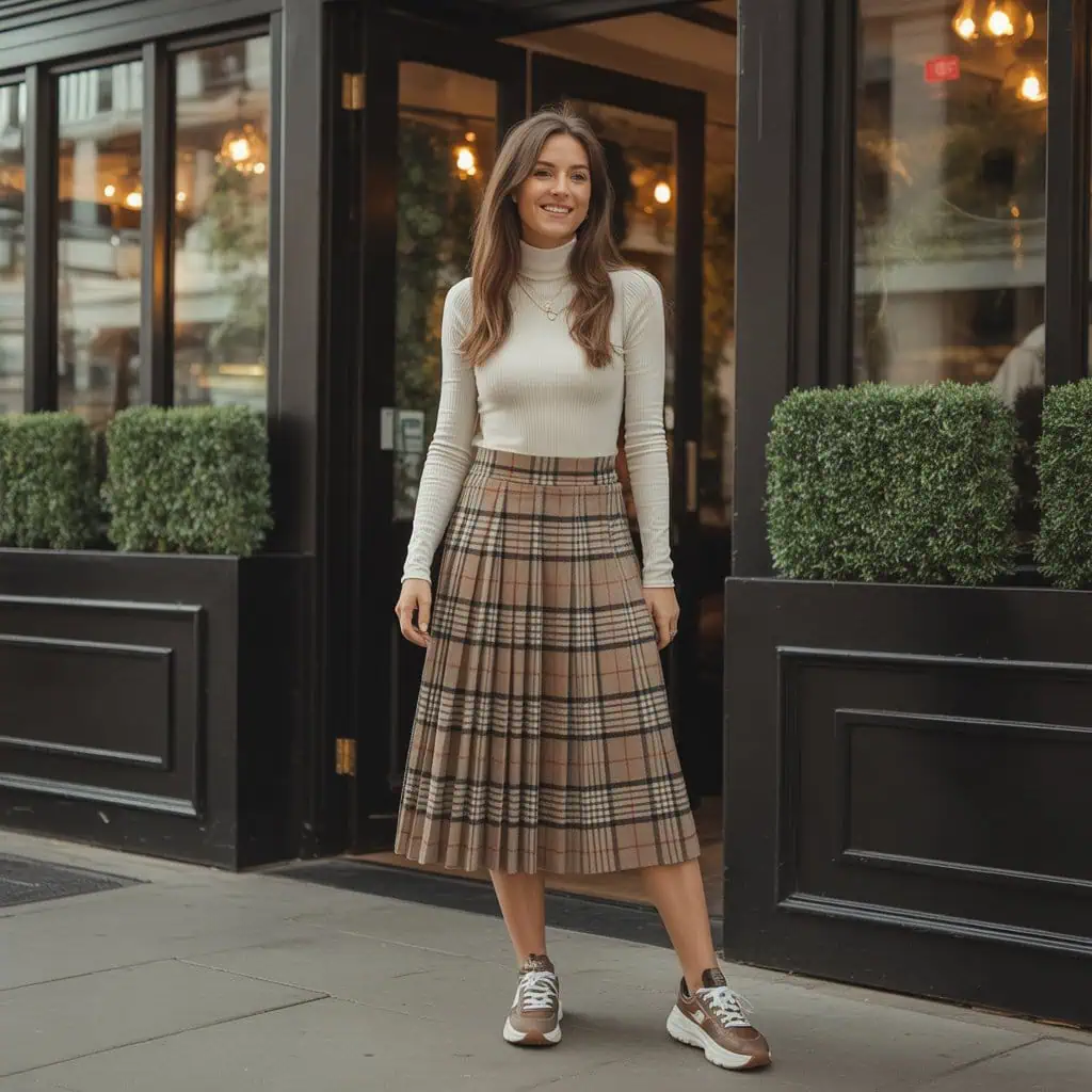 Associer des baskets à une jupe plissée et un col roulé offre l’équilibre parfait entre décontraction et chic.