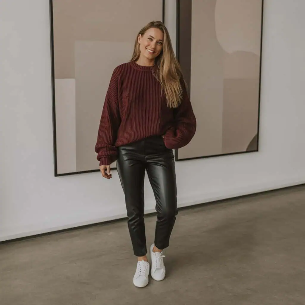 Un pantalon en cuir offre une silhouette élégante, moderne et stylée, tandis qu’un pull en grosse maille adoucit le look, créant un contraste attrayant.