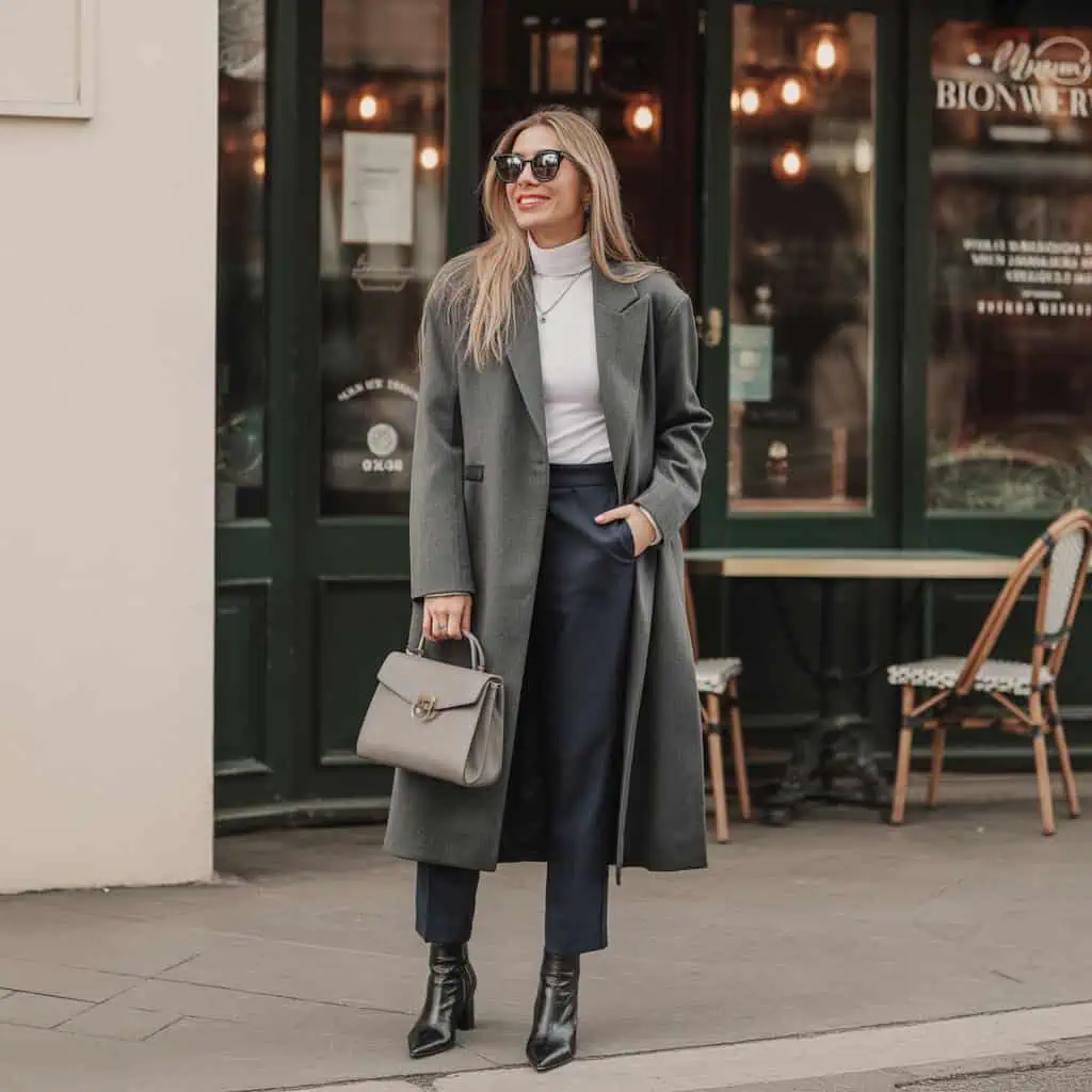 Opter pour un manteau classique en laine grise vous garde bien au chaud tout en constituant une pièce forte et polyvalente, idéale pour passer du jour à la nuit. Un col roulé blanc impeccable en dessous apporte une touche de luminosité douce, tandis que des bottines en cuir noir ajoutent une note rock à la tenue.