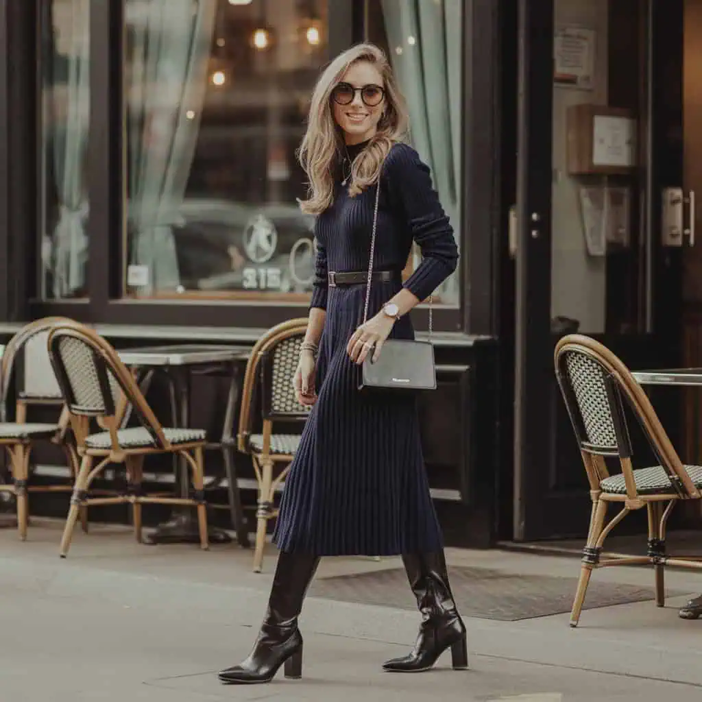 Une robe en maille associée à des bottes hautes compose une tenue à l’élégance décontractée, idéale pour les courses qui exigent une touche stylée. La robe en maille côtelée bleu marine, cintrée à la taille, flatte la silhouette tout en offrant un confort optimal, parfait pour une journée chargée.
