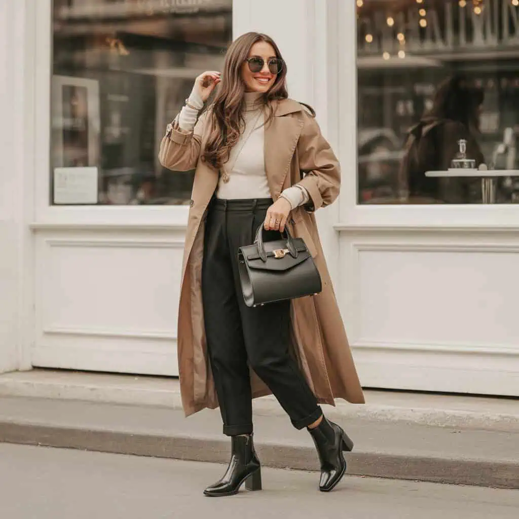 Un trench-coat classique associé à des bottines est la tenue idéale pour les journées chargées qui exigent une touche d’élégance.