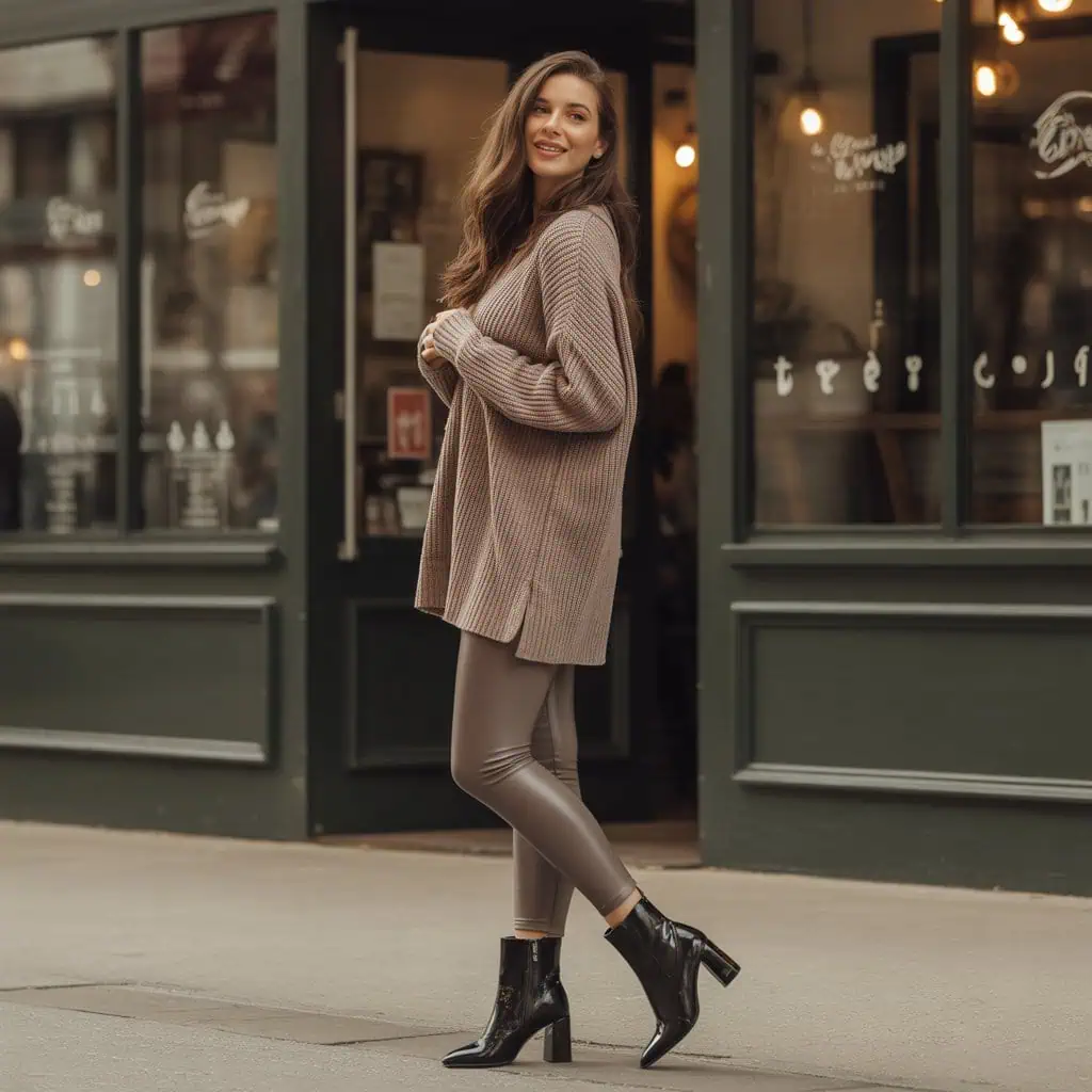 Porté avec un legging noir élégant, il crée une silhouette affinée qui allonge les jambes, parfaitement équilibrée par des bottines beiges à bout pointu qui ajoutent une touche de sophistication.