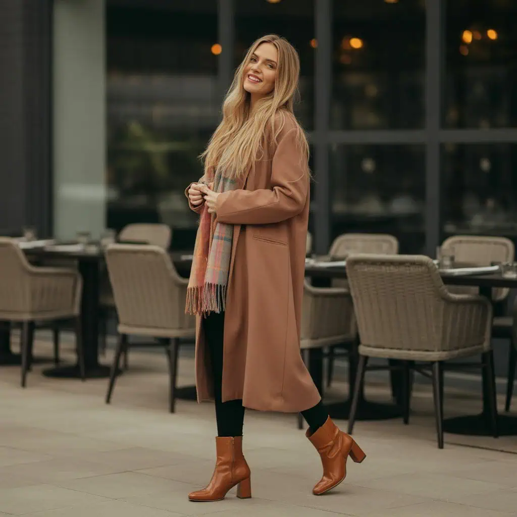 Des bottines cognac à talons carrés complètent l’ensemble, offrant à la fois confort et élégance. Ensemble, ces pièces allient avec brio praticité et style, prouvant qu’on peut rester bien au chaud sans sacrifier la mode.