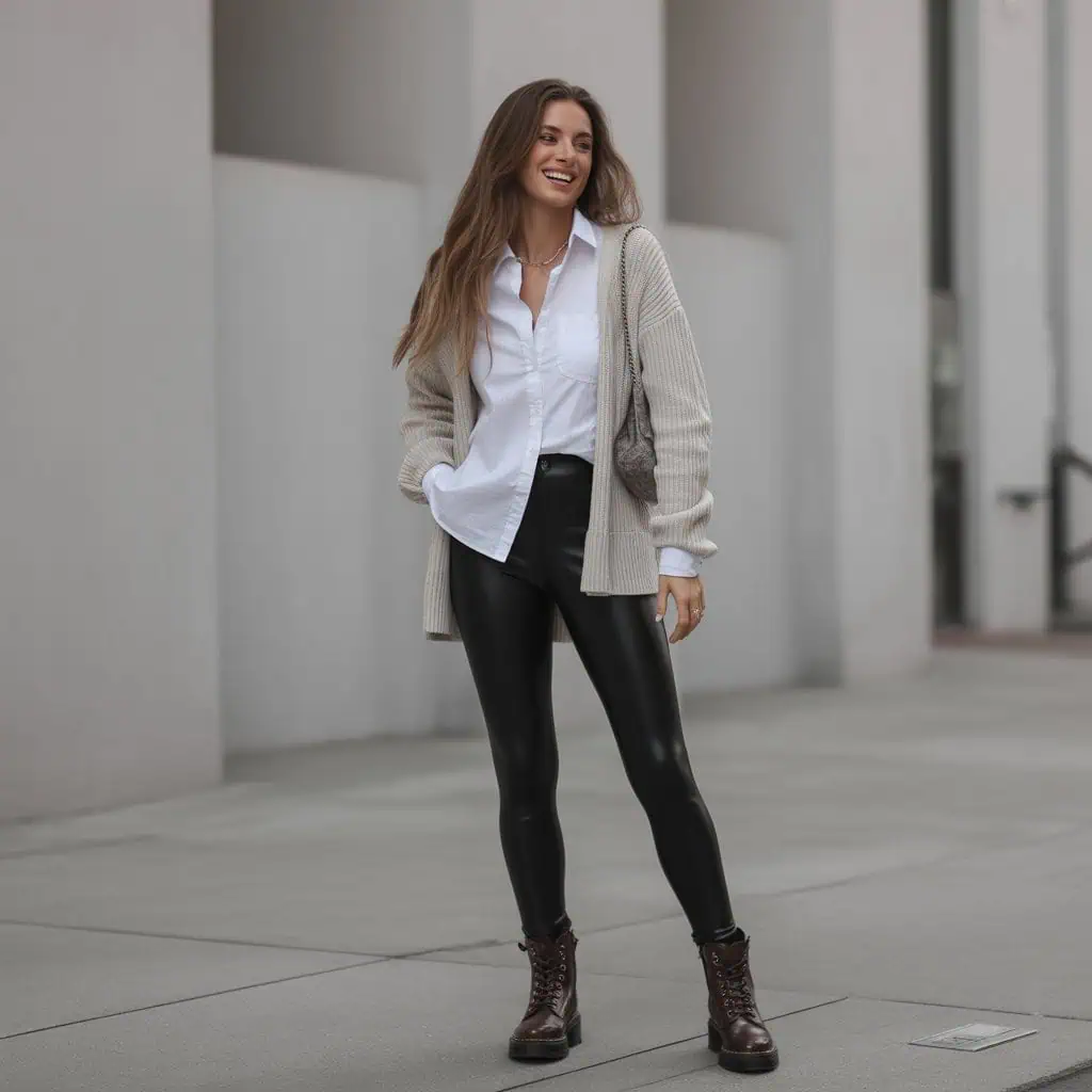 Associer un legging à une chemise blanche impeccable et un pull douillet est une formule qui allie confort et sophistication avec brio.