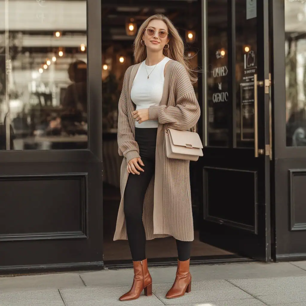 Adoptez l’art de la superposition avec un cardigan ceinturé, une pièce qui allie confort et style avec aisance. Porté avec un legging noir élégant, un top blanc ajusté et des bottines à talons carrés, ce look offre un équilibre parfait entre décontraction et sophistication.