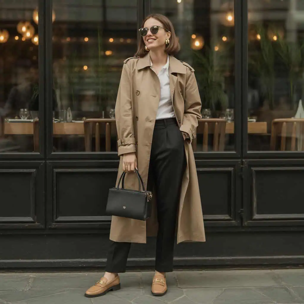 Difficile de faire plus intemporel que le combo trench-coat + pantalon tailleur. Ce duo dégage immédiatement une élégance parisienne irrésistible. Le trench apporte du mouvement et de la prestance, tandis que le pantalon tailleur structure la silhouette.