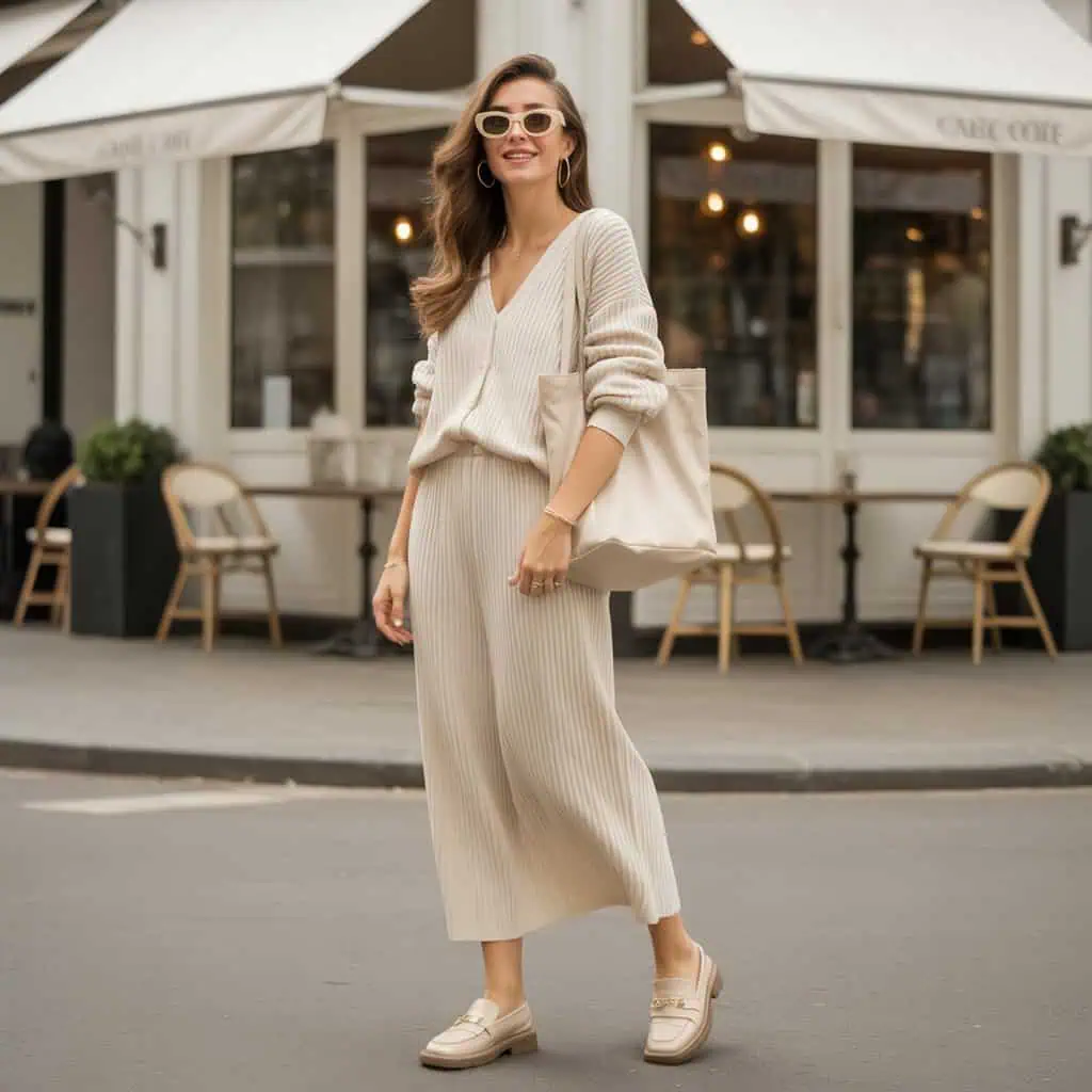 L’ensemble en maille monochrome fait partie des looks les plus élégants et confortables à la fois. Le haut ajusté associé à une jupe fluide ou un pantalon en maille crée une silhouette douce et harmonieuse, parfaite pour celles qui aiment les tenues minimalistes.