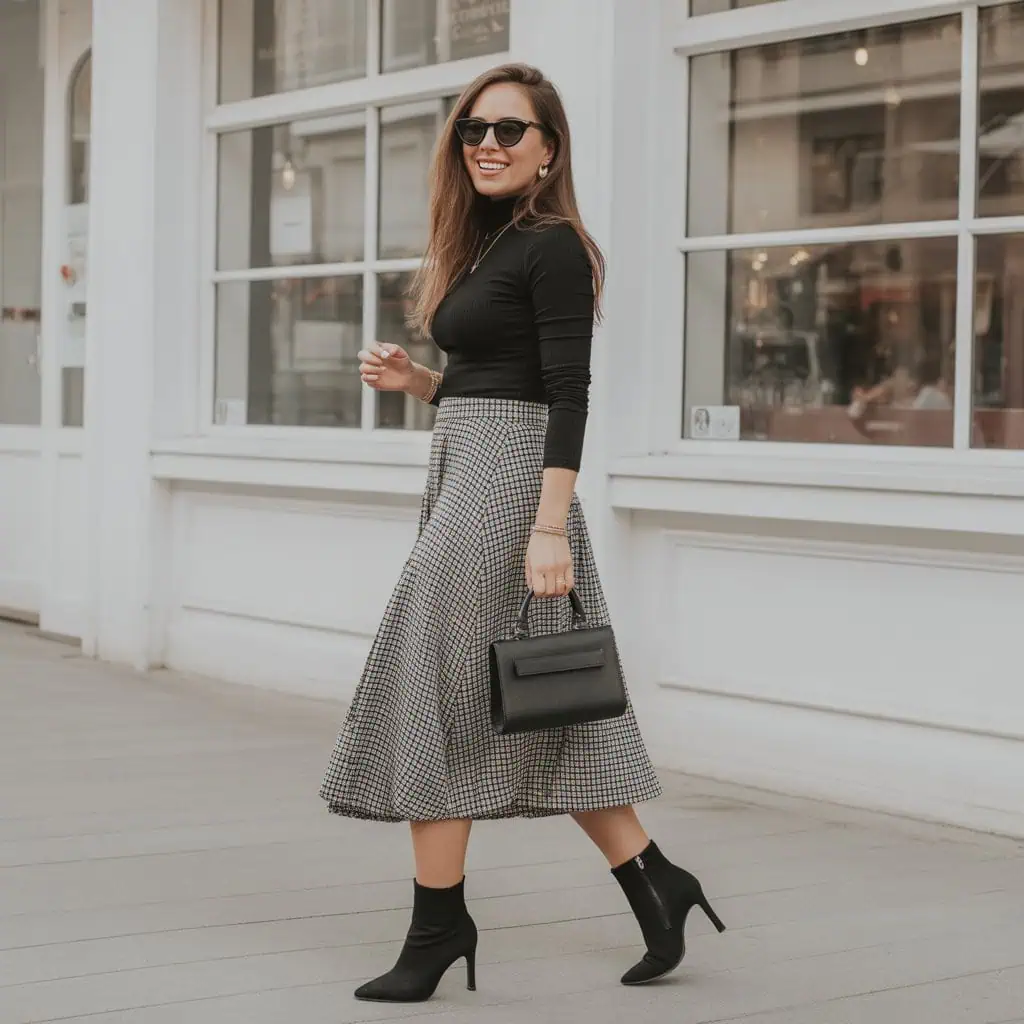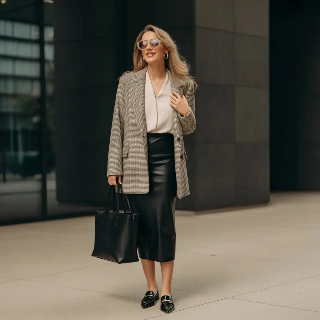 Le contraste entre la structure du blazer et la fluidité subtile de la jupe crée un effet visuel flatteur. Des mocassins pointus ou des bottines élancent la silhouette tout en garantissant un confort à toute épreuve. Un cabas chic et des accessoires discrets apportent la touche finale à ce look intemporel, idéal aussi bien pour le bureau que pour un brunch élégant.
