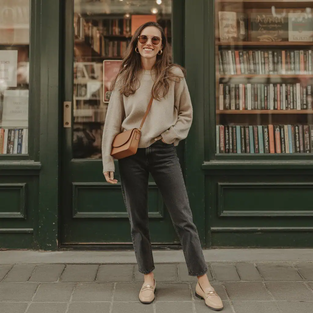 Avec des mocassins ou des bottines, vous obtenez une tenue confortable et stylée pour les journées actives en ville. Quelques accessoires bien choisis — lunettes oversize, sac structuré — suffisent à transformer cette association classique en look parfaitement moderne.