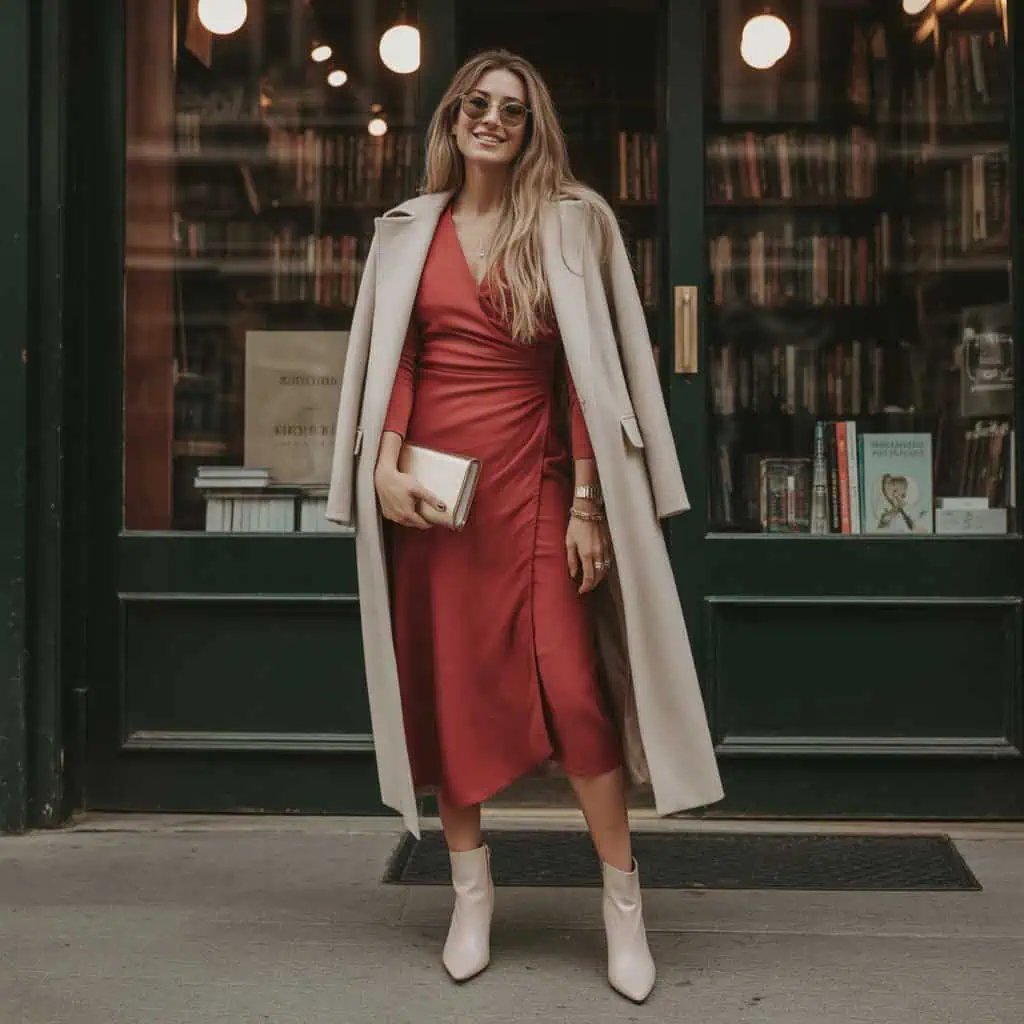 Associée à des bottines, elle gagne en modernité et en caractère. Pour les journées plus fraîches, un manteau crème ou camel posé sur les épaules apporte une touche lumineuse. Une pochette minimaliste et des bijoux délicats finissent d’équilibrer cette tenue féminine, facile à porter du matin au soir.