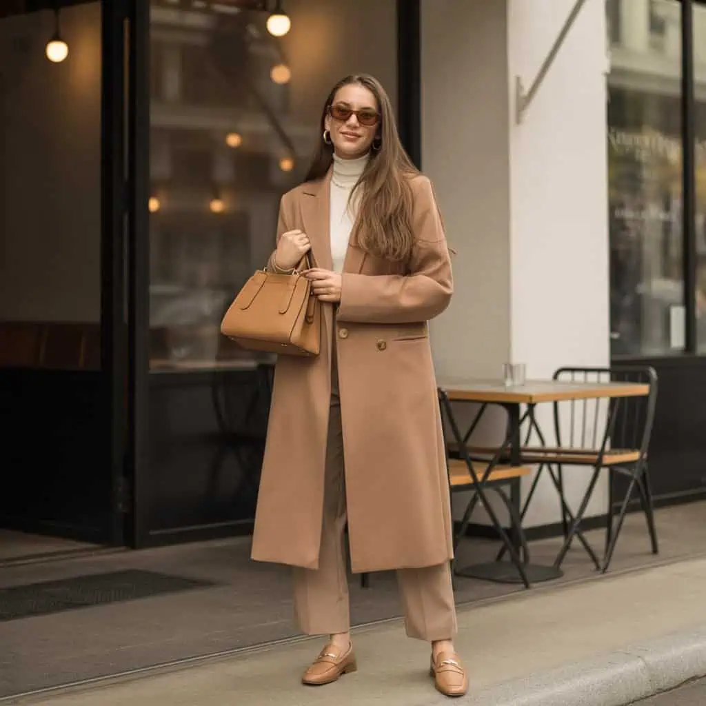 Le manteau camel est l’une des pièces les plus iconiques du dressing féminin. Sa couleur chaleureuse illumine le teint et s’associe naturellement à toutes les palettes neutres : blanc, beige, noir, gris ou même denim. Porté avec un pantalon droit, la silhouette devient immédiatement plus structurée, plus élégante et incroyablement polyvalente.
