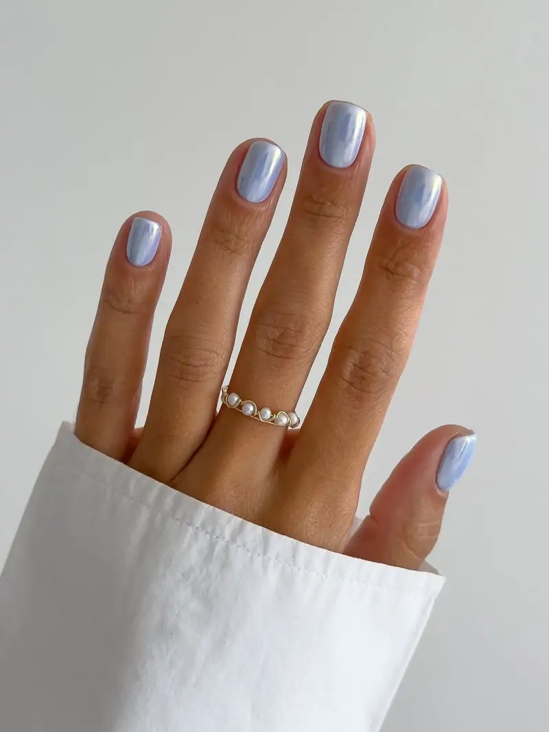 Pour un effet moderne et minimaliste, vous pouvez opter pour des teintes tendance comme le bleu pastel, qui apporte délicatesse et sophistication à toute manucure.