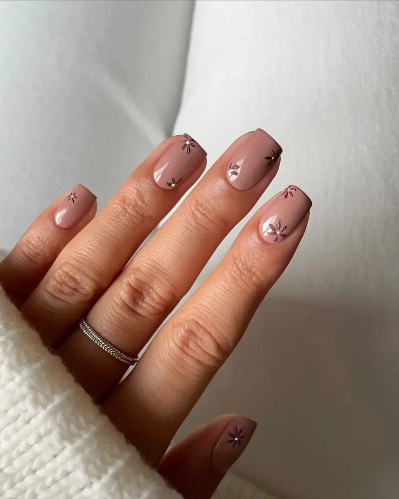 Pour celles qui préfèrent les designs simples, optez pour une base nude ou marron clair, ornée de petites fleurs minimalistes contrastantes.