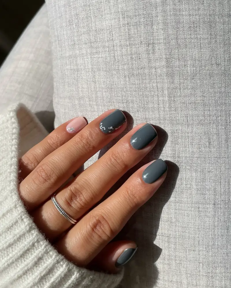Les tons gris sont incontournables cet hiver. Pour une touche d’originalité, on peut ajouter des détails en vernis argenté, comme une french manucure asymétrique inversée.