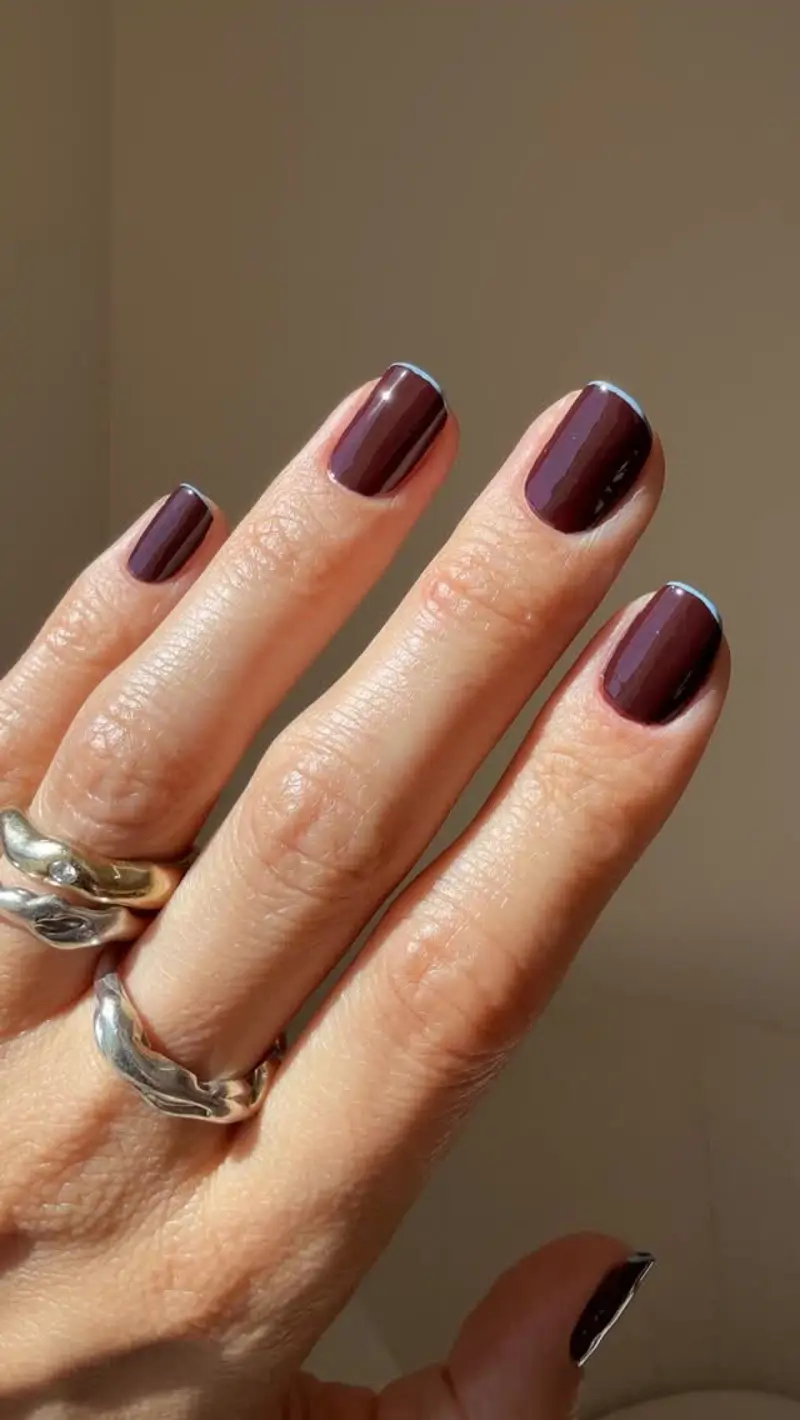 Le contraste des couleurs est l’élément phare de ce design. Contrairement à la manucure française traditionnelle, la base est d’un brun chocolat profond, tandis que la pointe de l’ongle, dans sa version la plus fine et minimaliste, est réalisée d’un bleu clair délicat.