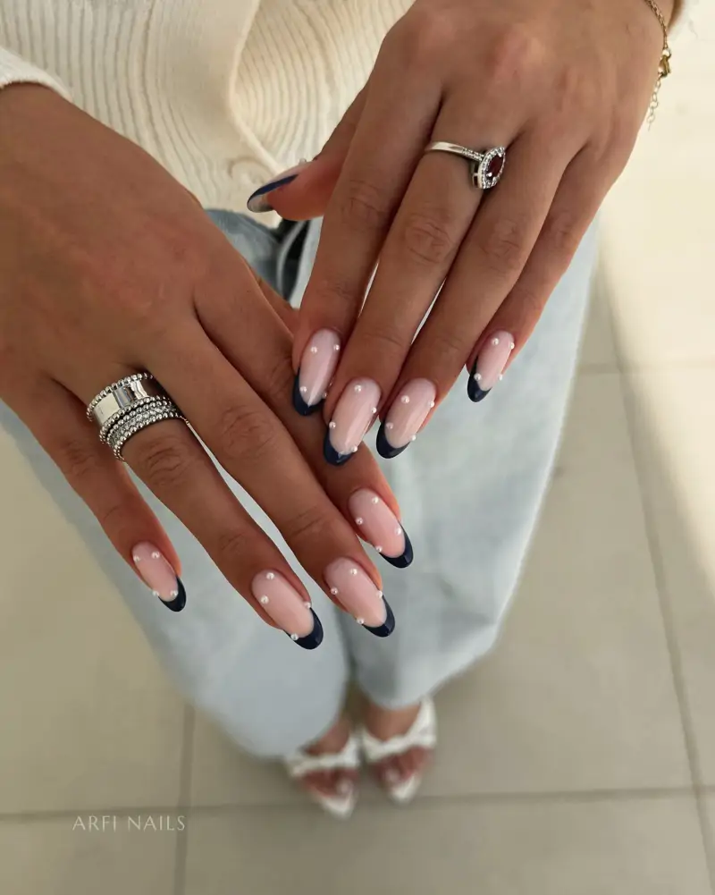 La manucure française classique se réinvente avec une teinte bleue audacieuse et éclatante, ornée de délicates perles en 3D. C’est un style parfait pour bien démarrer l’année pour un look plus sophistiqué et discret en ce début janvier.