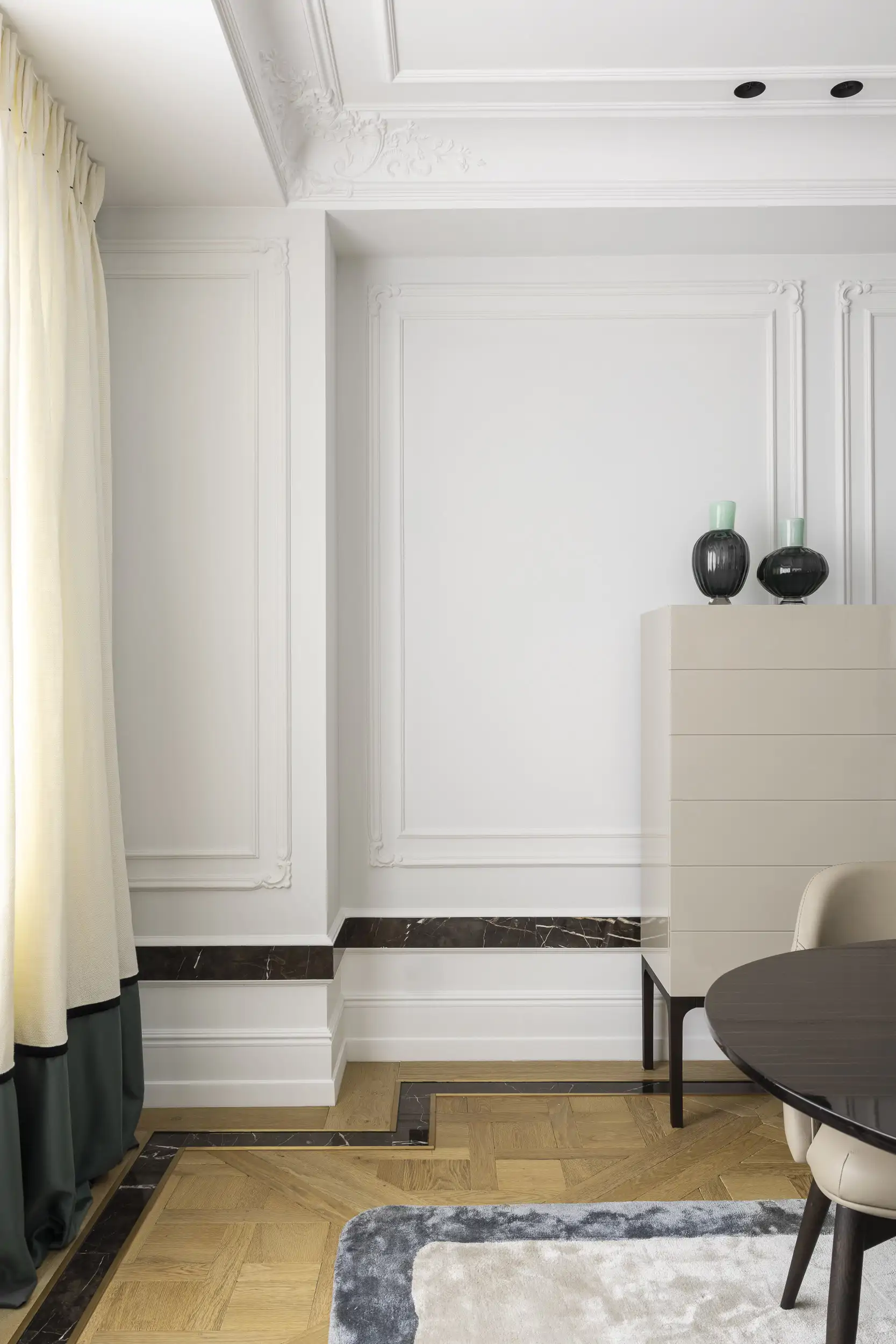 Lorsque l’aménagement spatial est réussi, cela se voit. Bonne disposition, matériaux de qualité, murs lambrissés , plafonds à zones avec moulures .