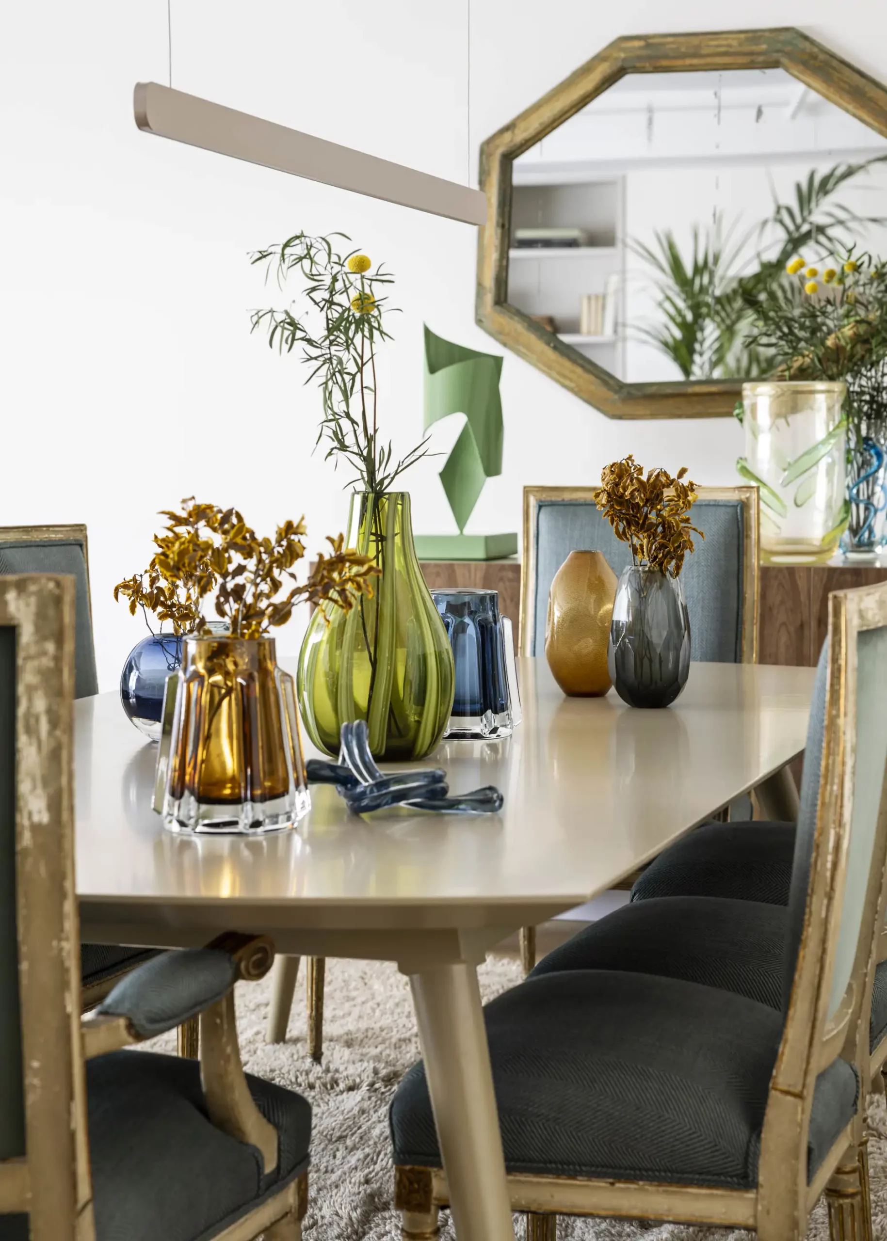 Une table vide se transforme ainsi en un coin élégant. J’ai rajouté une nature morte dans la salle à manger et je vois de suite la différence.