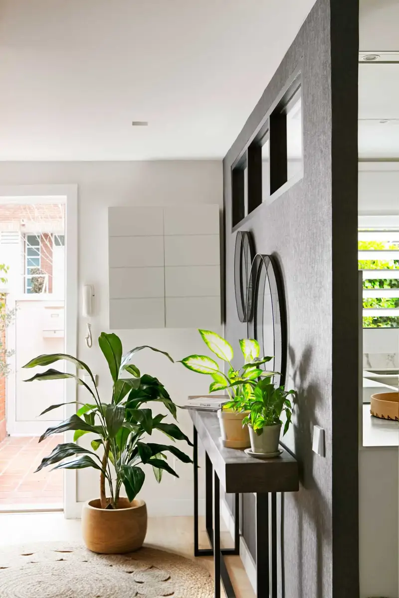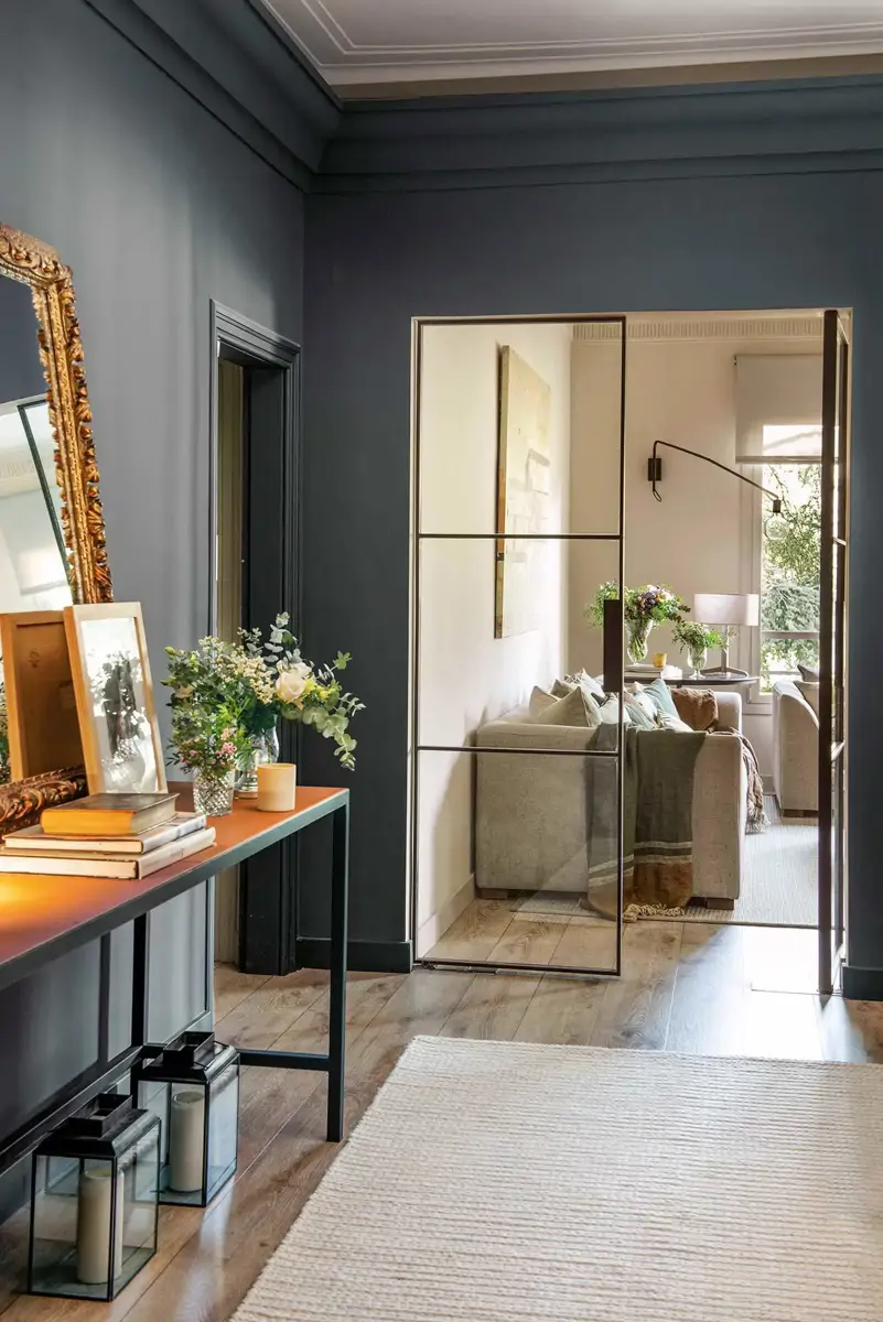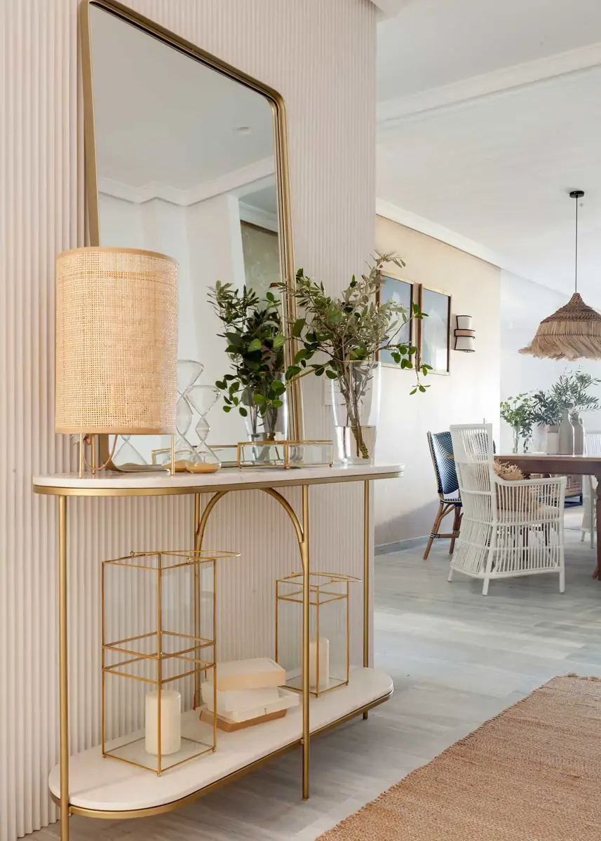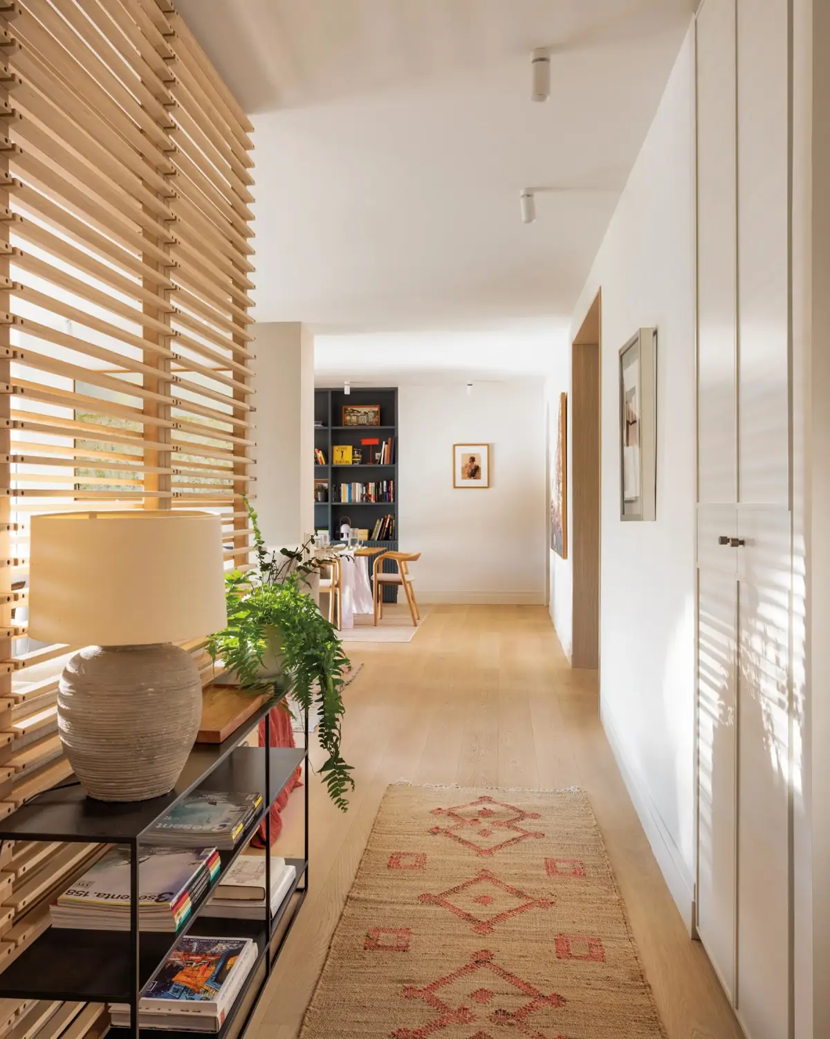 S’il y a bien un élément essentiel à la décoration d’un couloir, c’est le miroir. Et Alberto Aranda le confirme : Les miroirs sont toujours un allié précieux dans les petits espaces ; ils les agrandissent et les rendent plus lumineux .