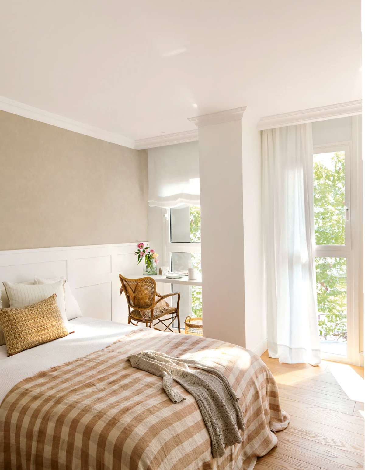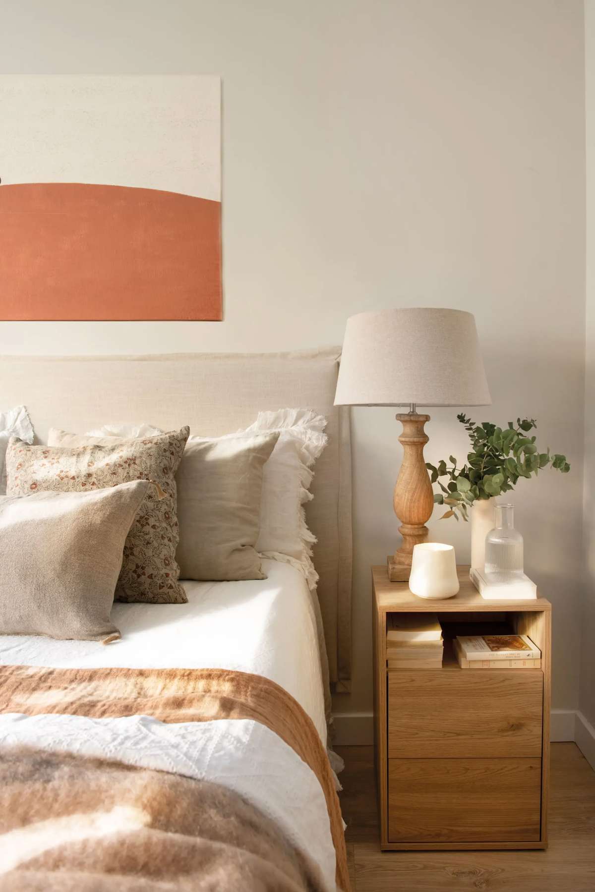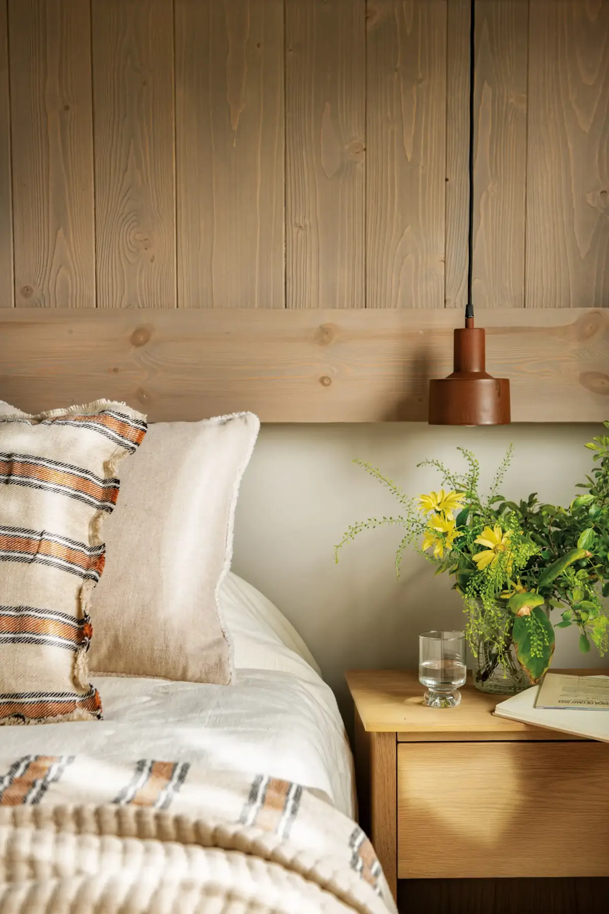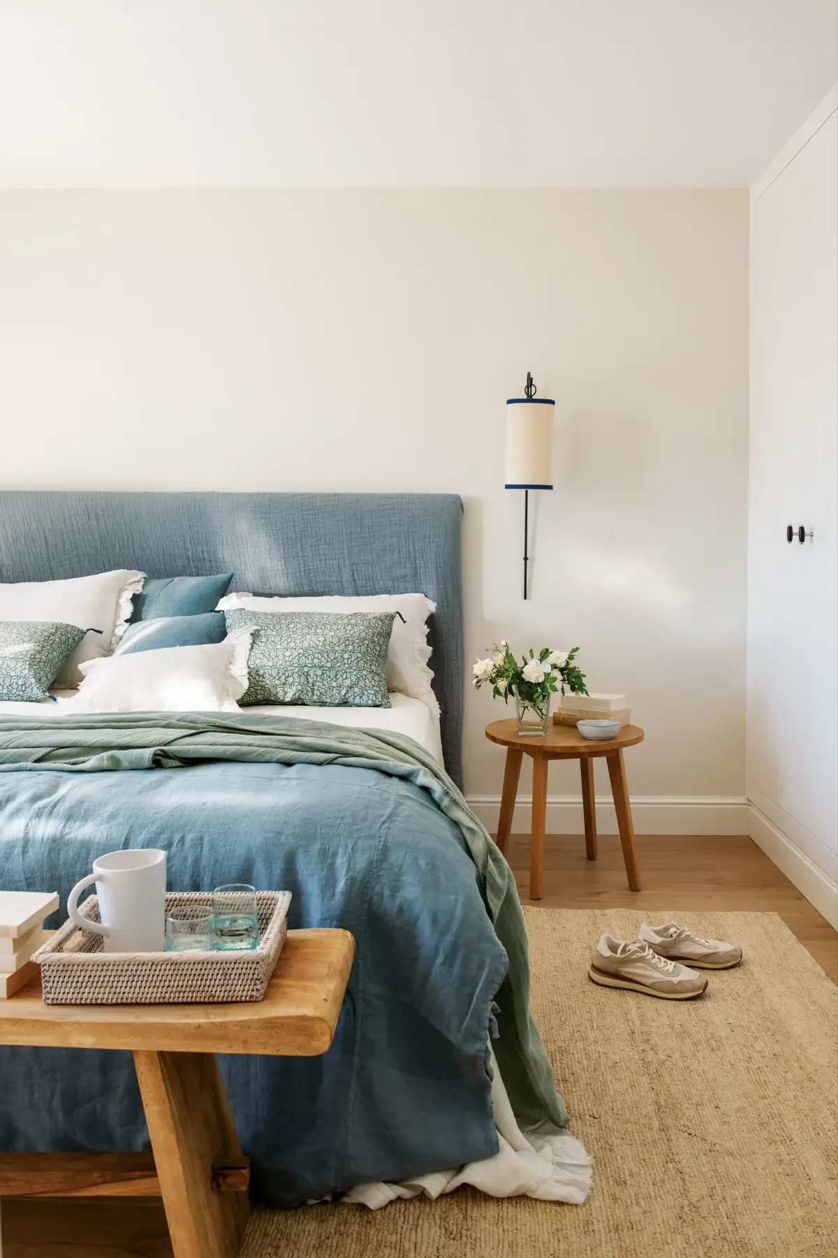 Pour une chambre lumineuse, les tons clairs sont essentiels. Cependant, rien ne vaut une touche de chaleur apportée par des tons naturels et quelques détails en bois.