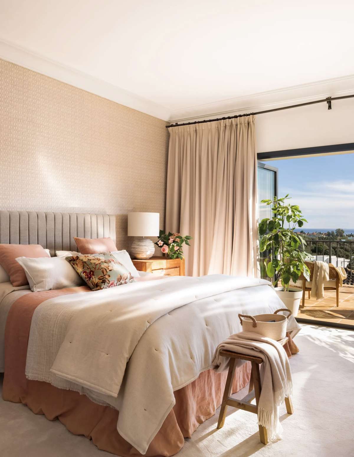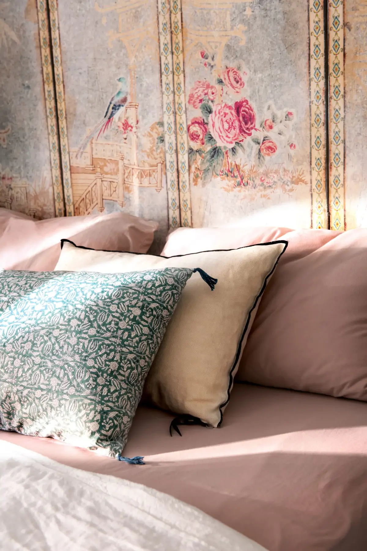 On adore la présence du paravent et du coussin à motifs au centre. En toile de fond, le linge de lit rose pâle crée une atmosphère élégante et apaisante.