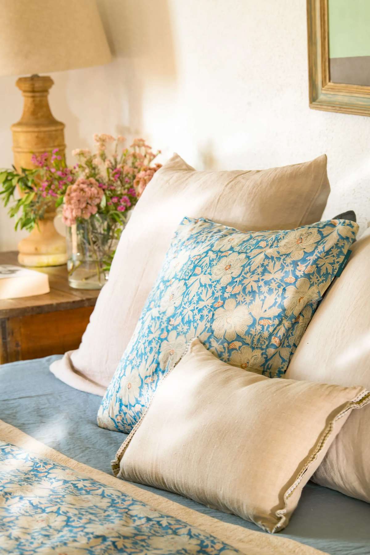 Ces imprimés bleu clair sont magnifiques sur un fond clair : du linge de maison lavé, du bois doux et une lampe à la lumière chaleureuse suffisent à parfaire le décor.