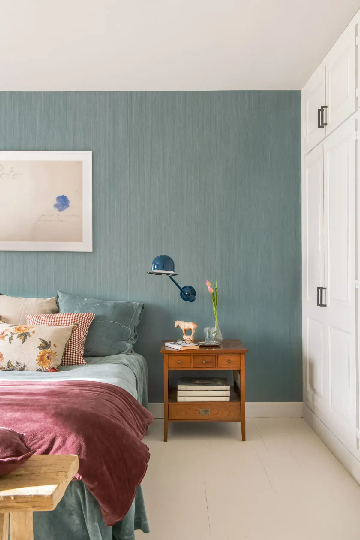 Les bleus pastel du papier peint, de la lampe et du coussin apportent une note gaie et fraîche à ce fond chaleureux. Une combinaison gagnante !