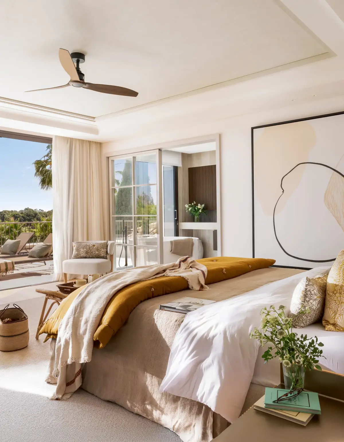Une chambre moderne peut aussi être l’ endroit le plus douillet au monde. Dans cette pièce lumineuse offrant une vue imprenable, le lit est paré de couleurs chaudes et d’une housse de couette d’un jaune moutarde saisissant.
