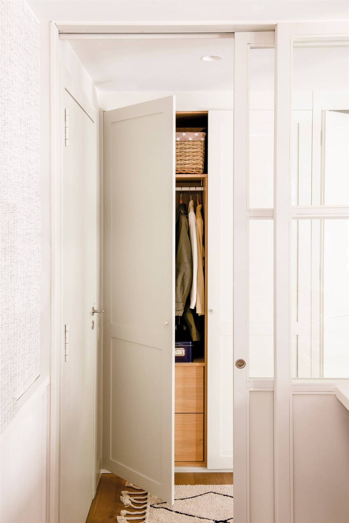 Ici, la décoratrice Marta Prats a dissimulé un placard encastré complet dans l’entrée, qui s’harmonise parfaitement avec les murs grâce à la peinture assortie.