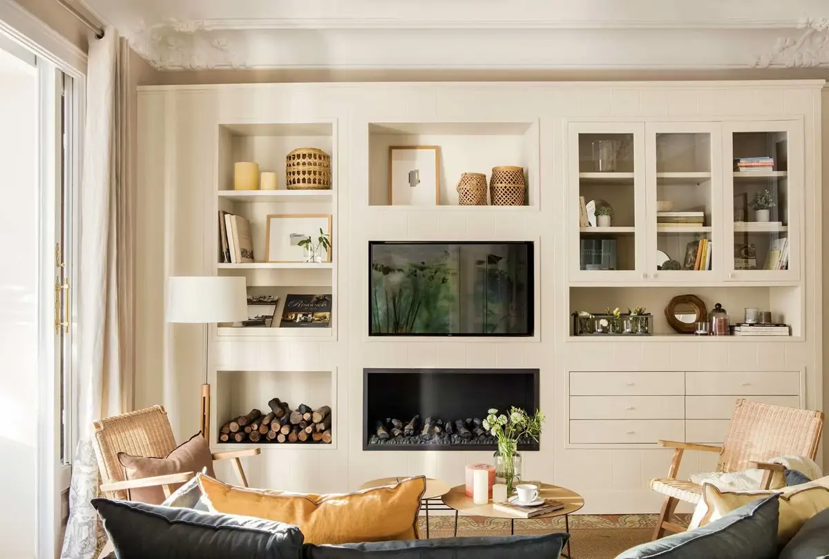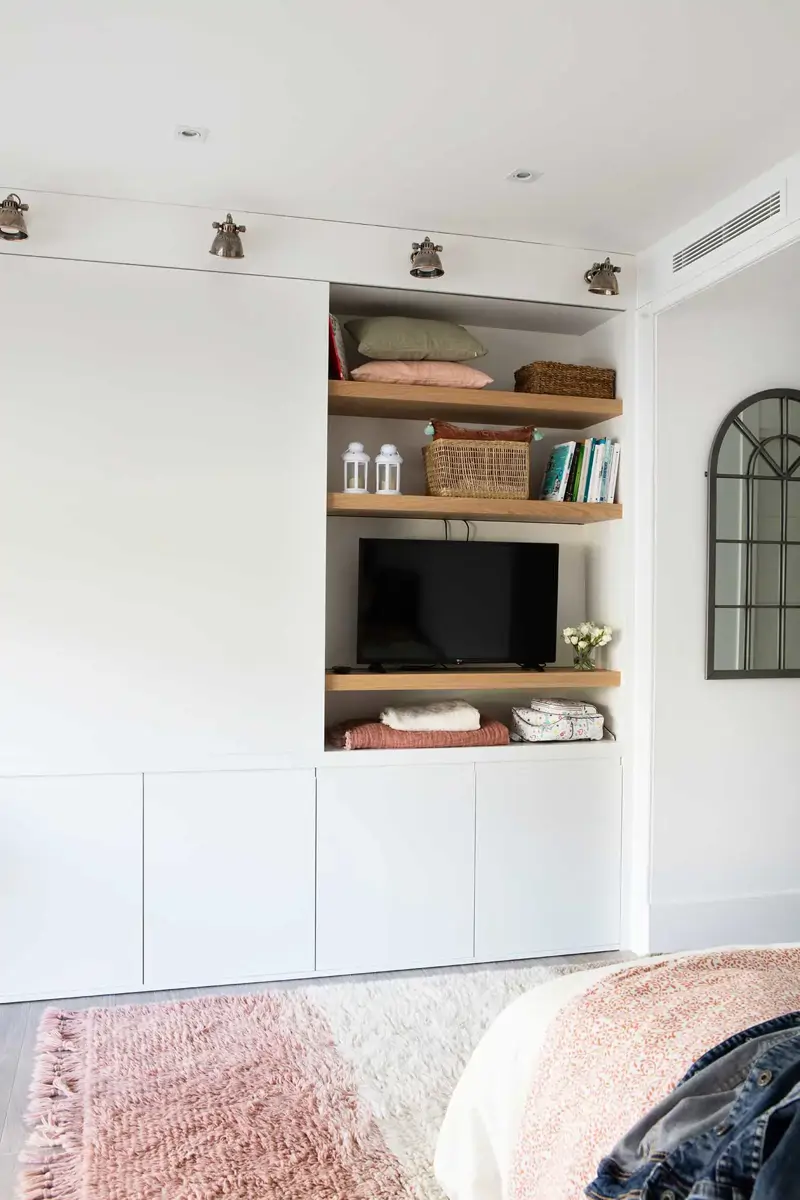 Une bonne idée est de les dissimuler dans un placard ou une bibliothèque, comme ici. Une porte coulissante dissimule le téléviseur lorsqu’il n’est pas utilisé, et des étagères en bois avec des livres et des éléments décoratifs apparaissent.