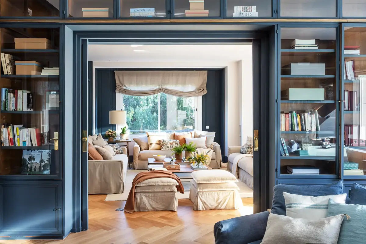 Une autre façon d’insuffler une touche d’intensité à un salon est de peindre une bibliothèque. Grâce à l’ajout d’éléments, elle ne sera jamais aussi sombre qu’un mur. Ici, chaque centimètre carré de l’espace a été exploité, car la bibliothèque entoure une porte coulissante, elle aussi peinte dans ce magnifique bleu anglais. Cette couleur convient également aux petits espaces.