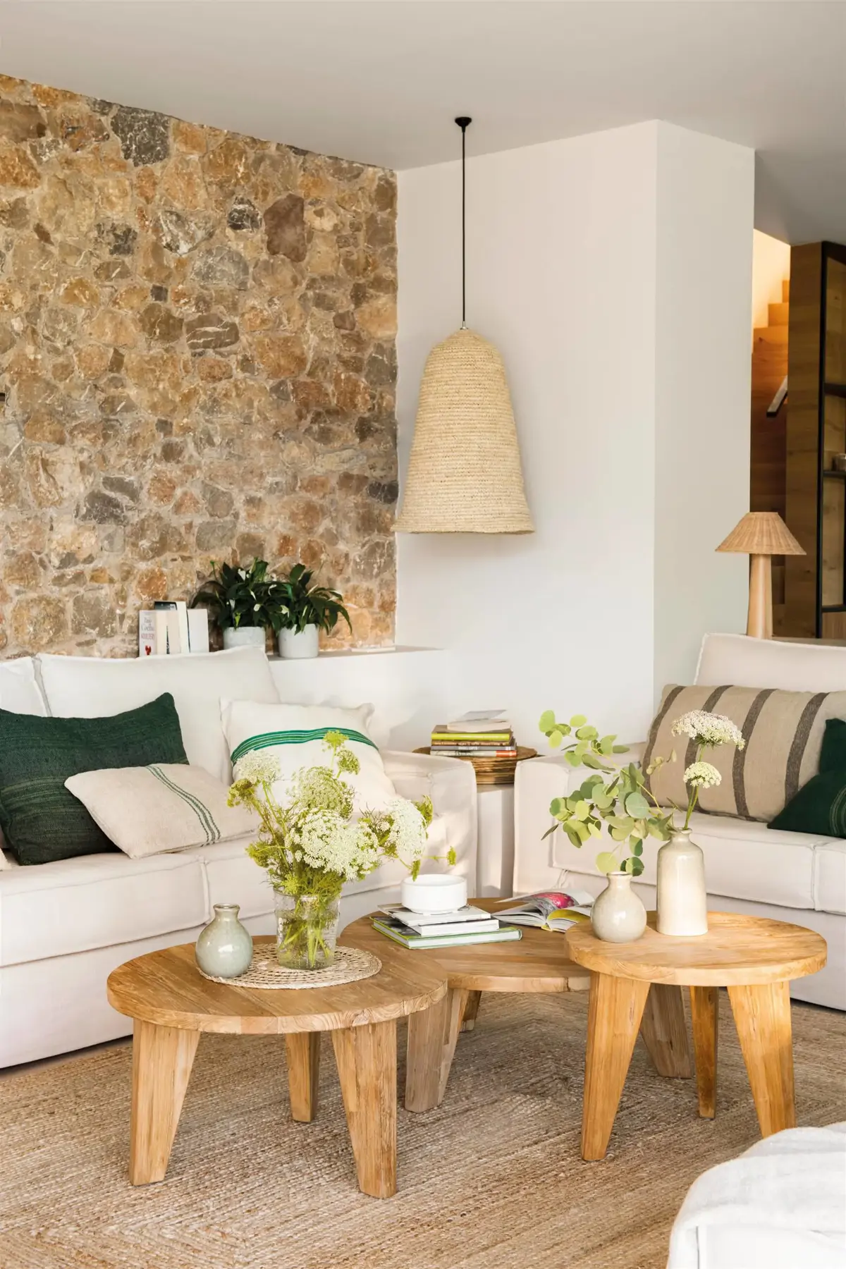 Associé à des murs blancs et à des designs modernes, vous obtiendrez un style authentique. Ici, les différentes nuances de pierre inspirent et se retrouvent dans les tissus, les abat-jour, les tapis et le bois, créant une palette de couleurs et de textures variées.