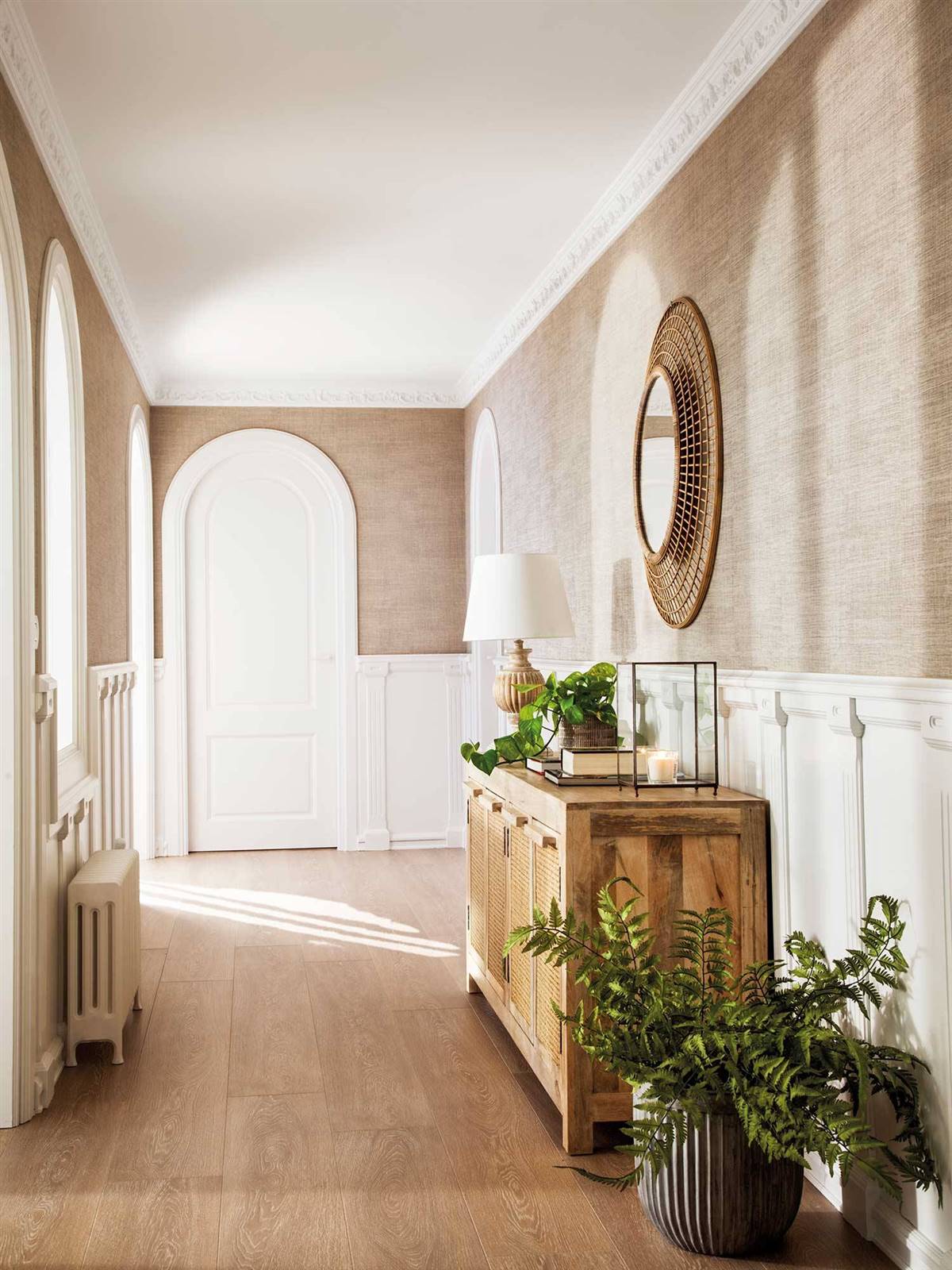 Les papiers peints effet textile sont parmi nos préférés, car ils sont très élégants et créent un effet mural chaleureux, comme dans ce couloir. Ils nous permettent facilement de délimiter un espace.