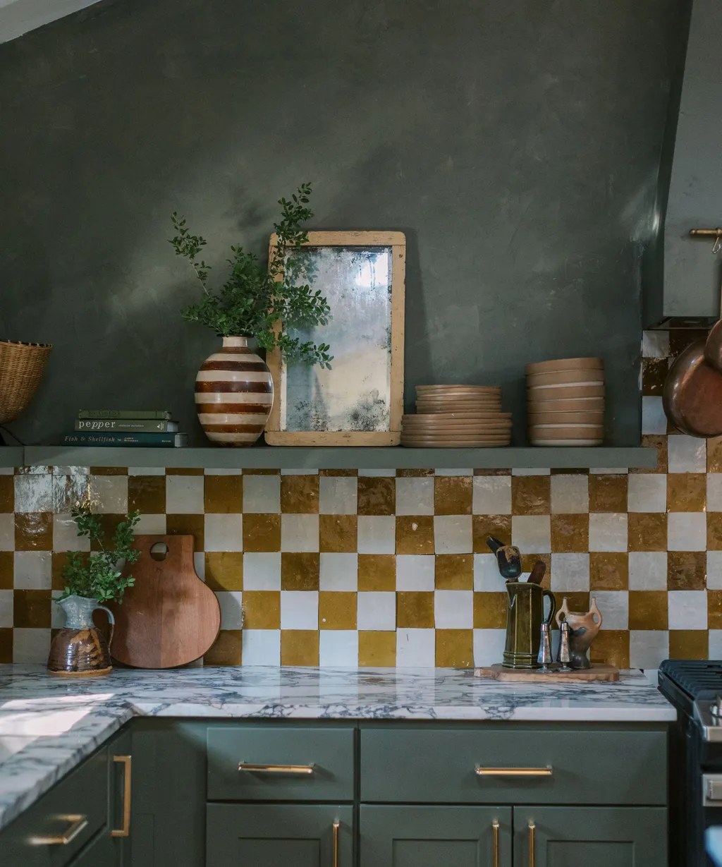 Cela apporte immédiatement une touche de luxe naturel et sur mesure qui contraste magnifiquement avec les comptoirs plus clairs (marbre, quartz blanc) ou les poignées en laiton.