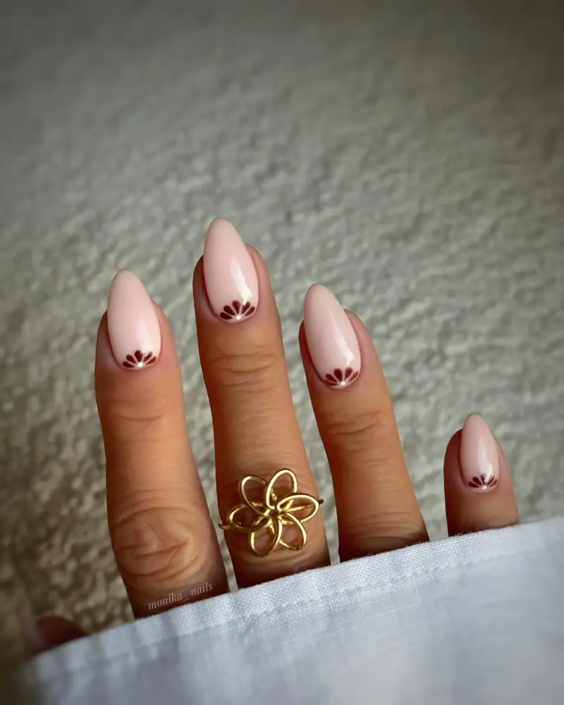 Dans les tons nude, le beige est un choix classique et infaillible : facile d’entretien, il constitue la base parfaite pour des motifs tels que les imprimés à pois ou d’autres plus élaborés – mais tout aussi discrets –, comme une manucure française inversée avec des pétales de fleurs.