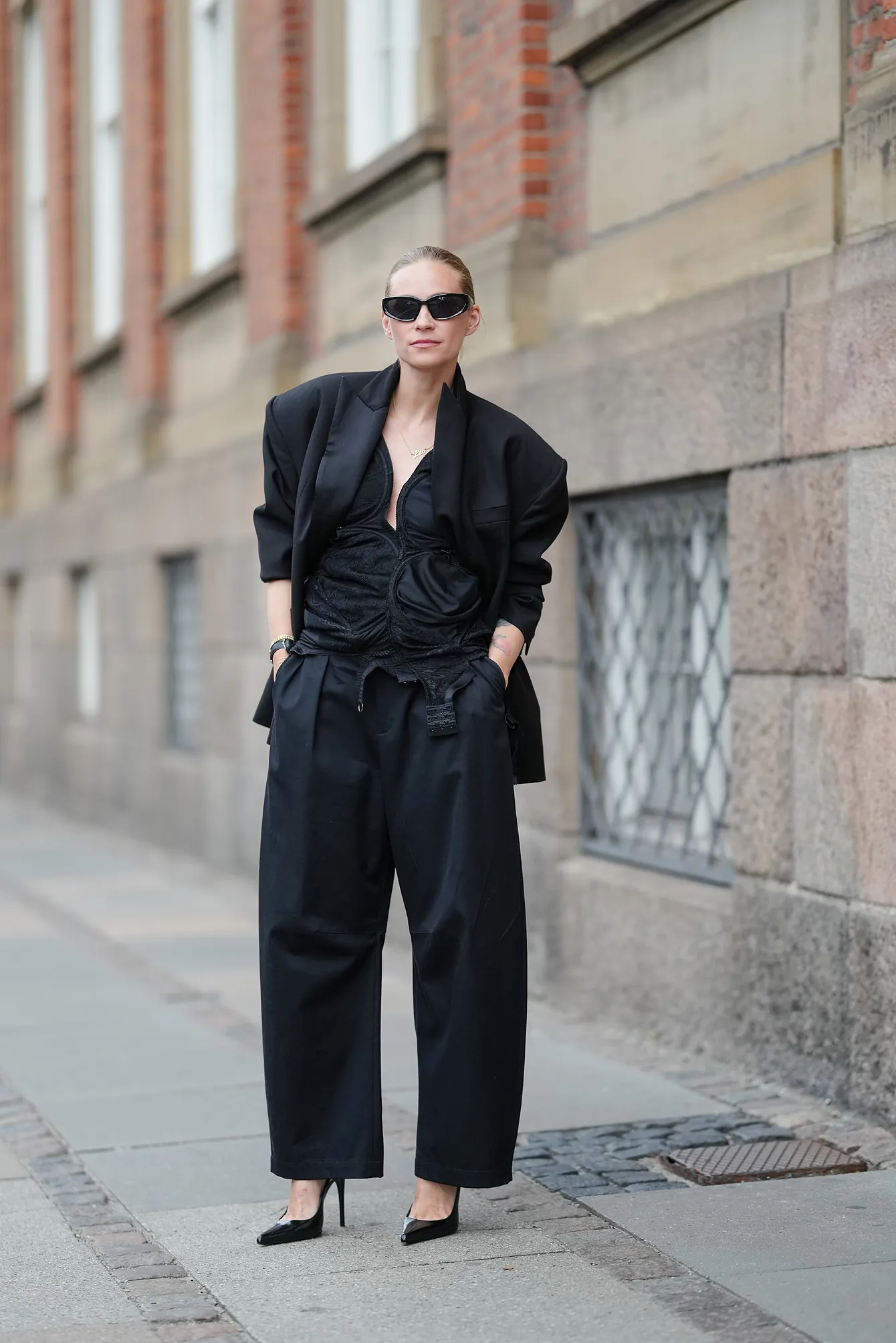 Un look entièrement noir, monochrome, peut aussi être très sophistiqué. Pour éviter un effet trop discret, il faut créer un effet surprenant avec une pièce forte ; Tine Andrea y parvient en portant un chemisier froncé original et un pantalon oversize. On adore également le retour des escarpins classiques.