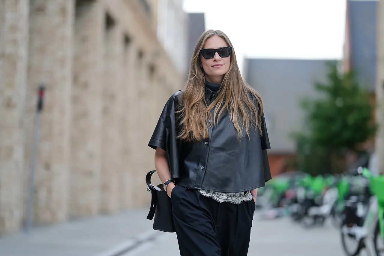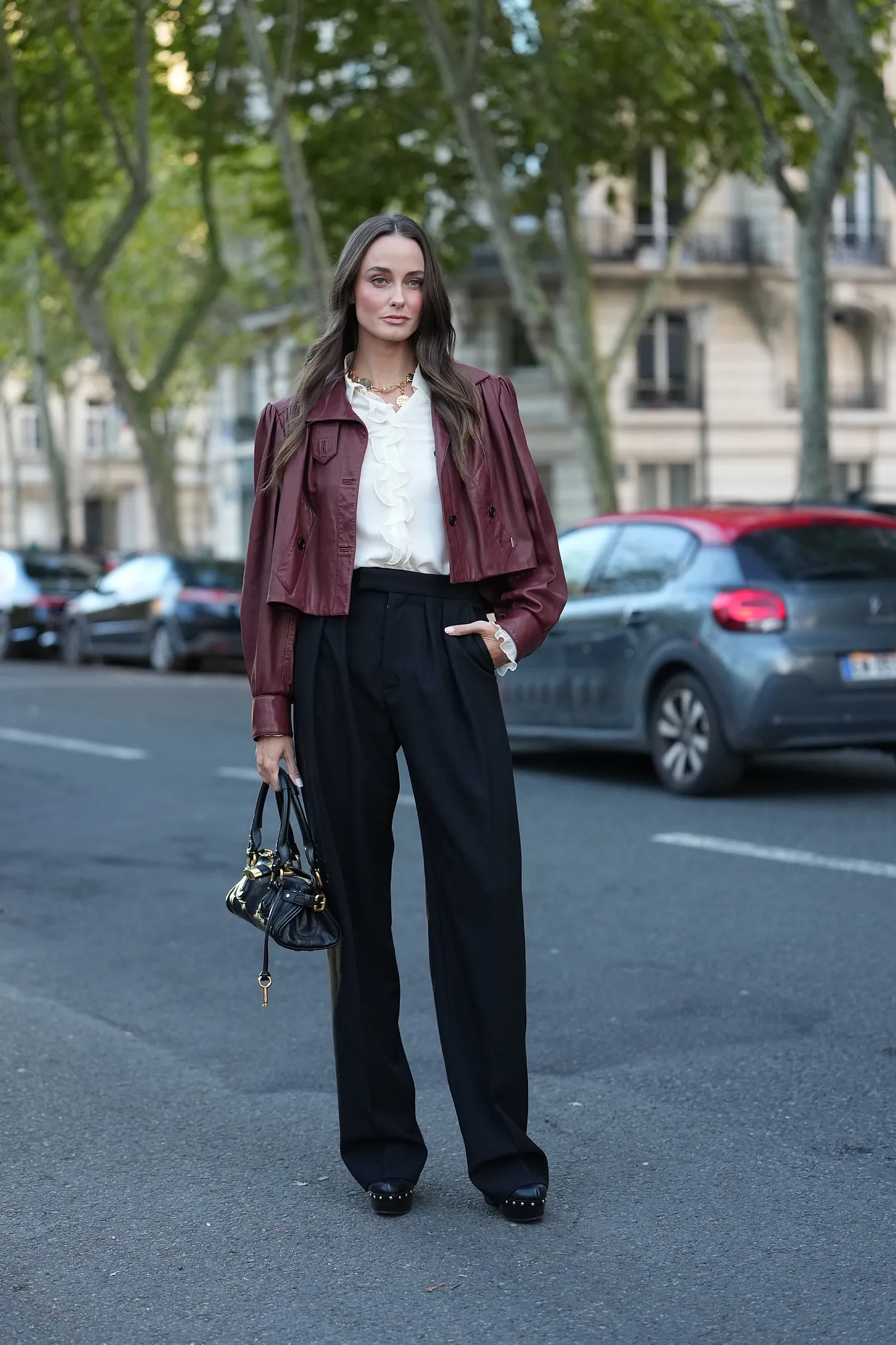 Nous vous suggérons donc d’associer un pantalon plissé noir à des sabots, un chemisier à volants et une veste en cuir. C’est une façon d’adopter le nouveau style bohème chic popularisé par des marques comme Chloé.