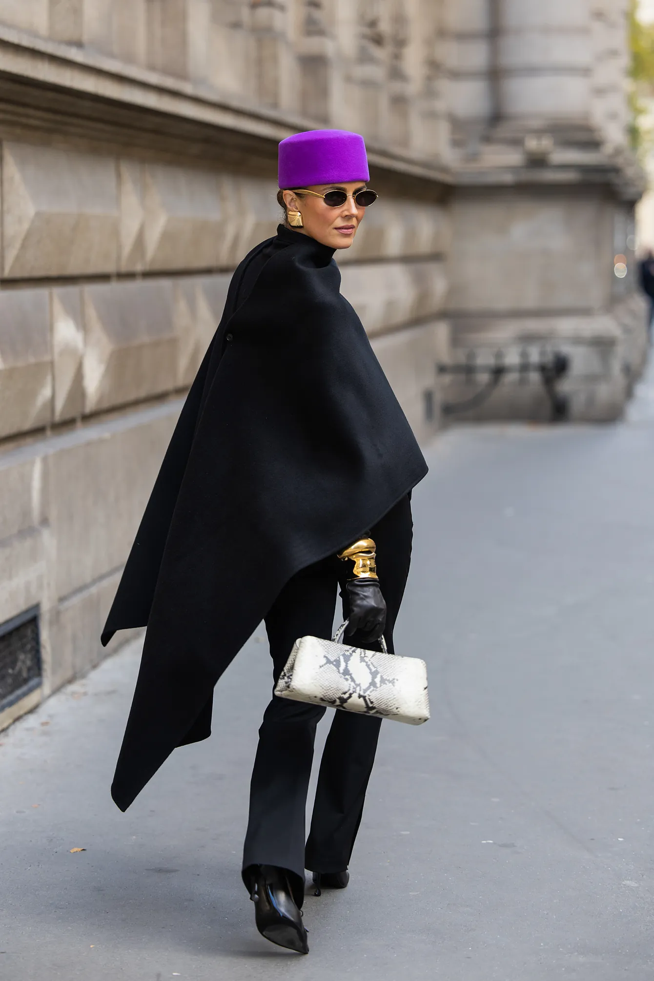 Si le pantalon noir est souvent associé à une tenue classique, il peut aussi s’intégrer à un style plus audacieux et tendance. Adoptez l’esthétique Glamoratti (inspirée du luxe des années 80) et créez un look « plus on en met, mieux c’est », à l’image de la photo.